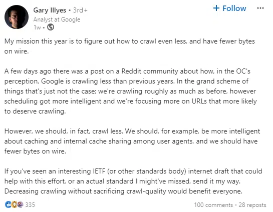 Google Analyst Gary Illyes stated on LinkedIn, “My mission this year is to figure out how to crawl even less.”