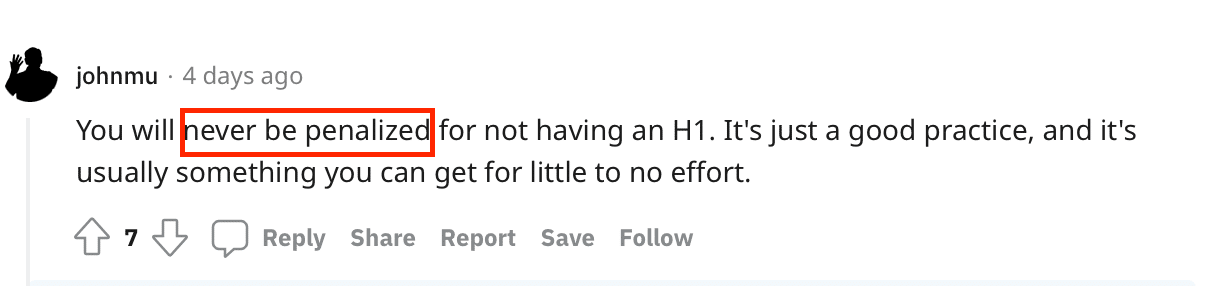 Making it clear once again about Google’s stand on H1, John Mueller, on a Reddit discussion, said that search algorithms will “never” penalize a website or a webpage for not using H1 within the body.