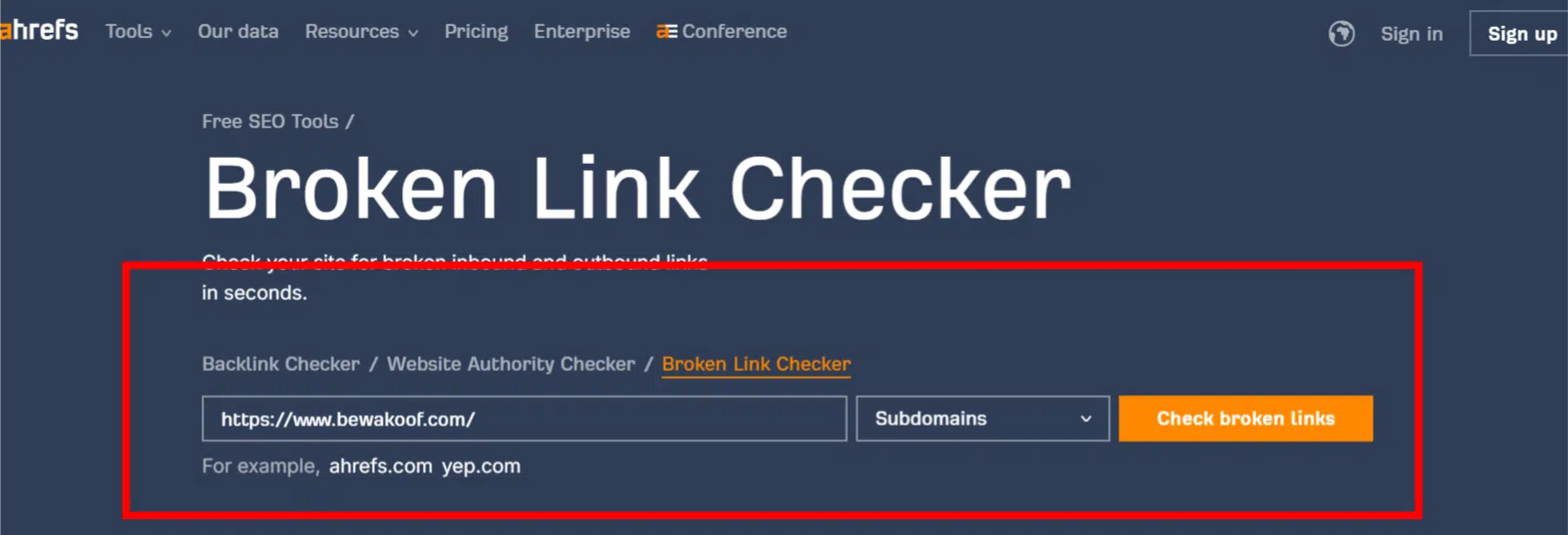 Here are some popular tools that I recommend for checking broken links: Ahrefs Webmaster Tool, Google Search Console, SEMrush, and Ahrefs Site Explorer.