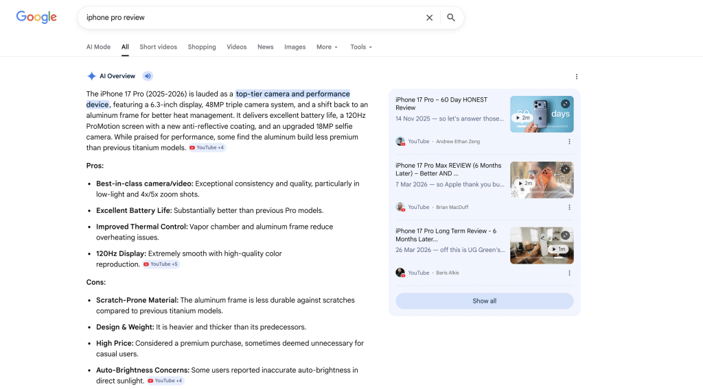 For large corporations navigating reputational sensitivity, the stakes are highest. When a brand has experienced a recent lawsuit, recall, or public controversy, searches combining the brand name with terms like “news” or “reviews” increasingly lead with an AI Overview that surfaces and summarises the negative event β€” drawing from news articles, regulatory filings, and forum discussions.