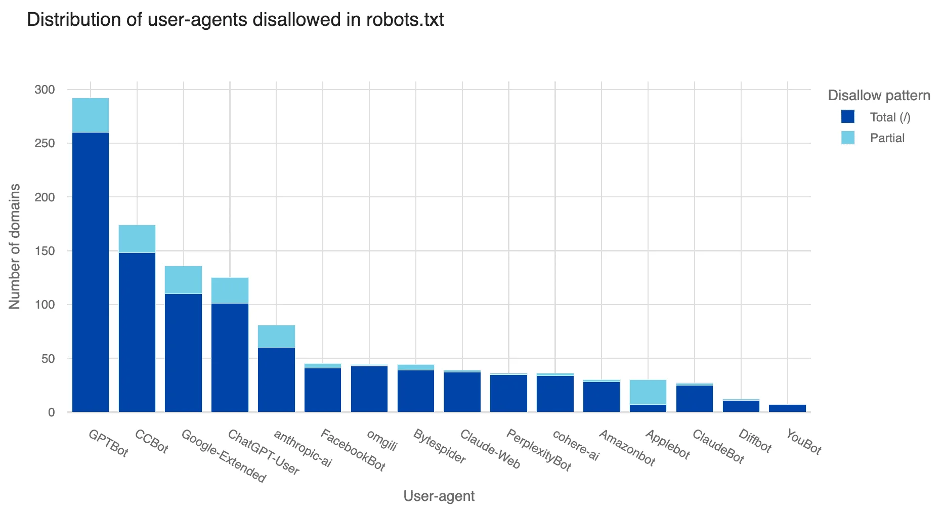 This graph illustrates the number of domains that have disallowed various user agents through their robots.txt files. The user agents are categorized by total disallowance (/) and partial disallowance (specific subfolders or pages).