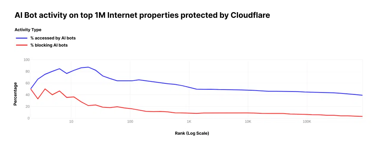 This graph shows the percentage of the top 1 million Internet properties accessed by AI bots versus those blocking AI bots.