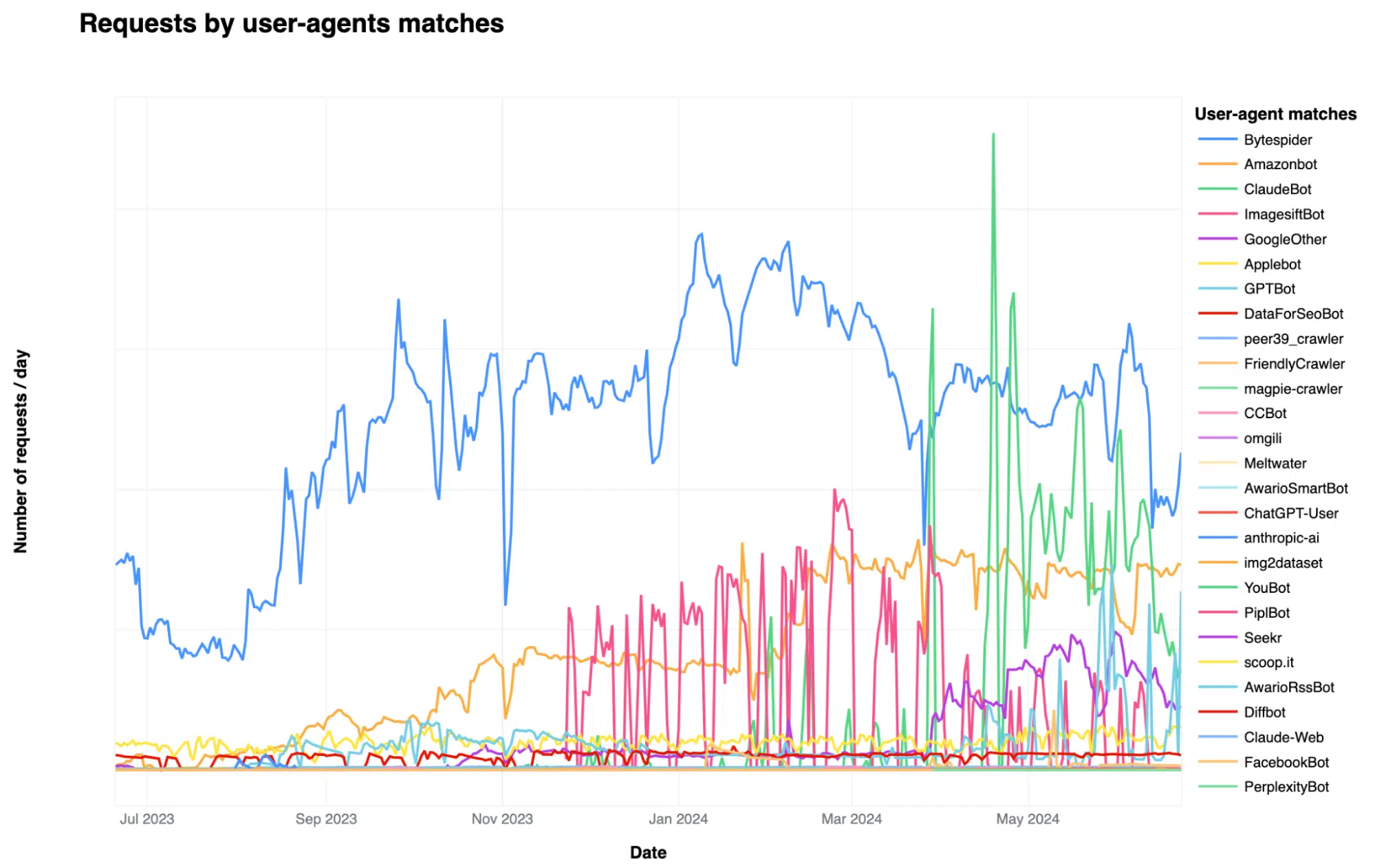 - Bytespider: Shows significant fluctuations in requests, indicating varied crawling activity. Peaks might correspond to specific data collection campaigns.