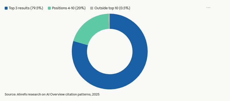Research shows 99.5 percent of AI Overview citations come from top 10 organic results, and nearly 80 percent come from the top 3 results.
