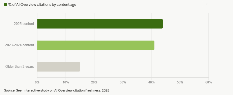 A study by Seer Interactive found that 85 percent of AI Overview citations were published in the last two years, with 44 percent of them from 2025 alone.