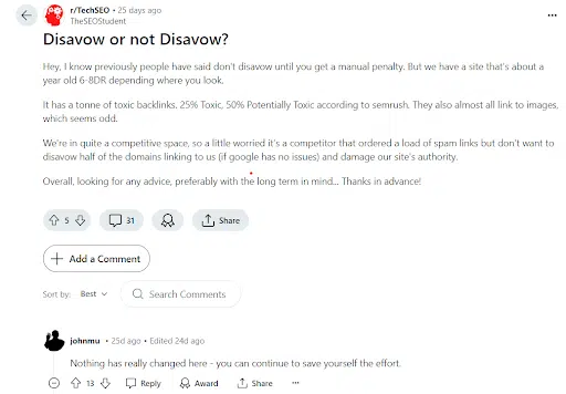 John Mueller, another prominent Google spokesperson, on Reddit, had criticized the concept of “toxic links” as a construct by SEO tools for profit, advising against disavowing links unless a manual penalty is received.