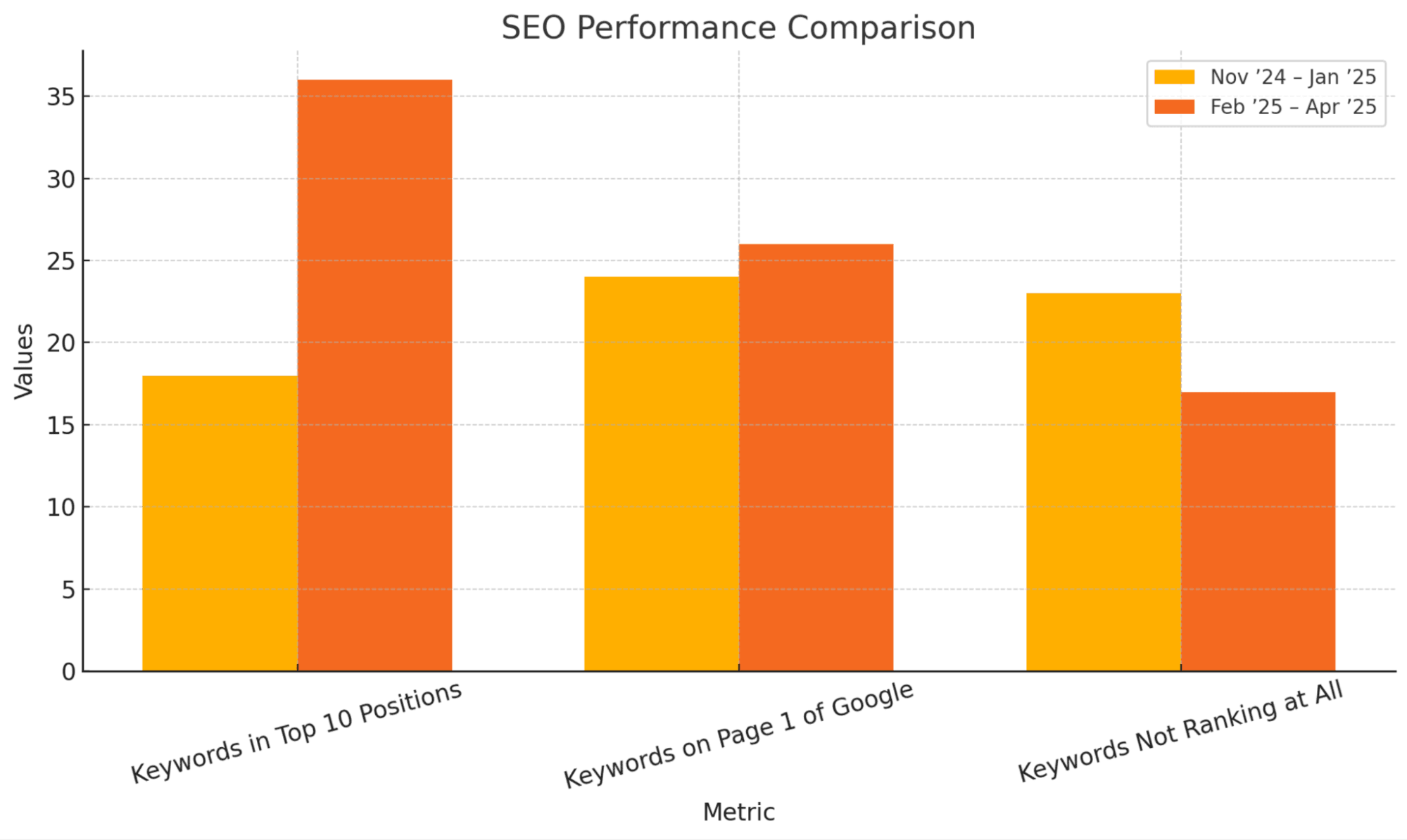 | Keywords on Page 1 of Google | 24 (28.2%) | 26 (30.6%) | ↑ Consistent |